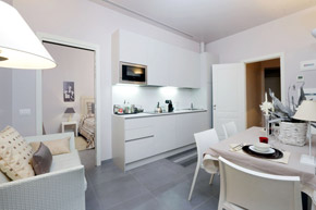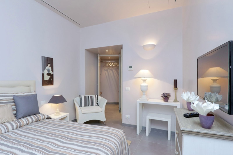 Le due camere da letto hanno il proprio bagno privato ed una spaziosa cabina armadio. La terza camera, al centro tra le camere da letto, ha una moderna ed attrezzata cucina. Le ampie finestre della suite affacciano